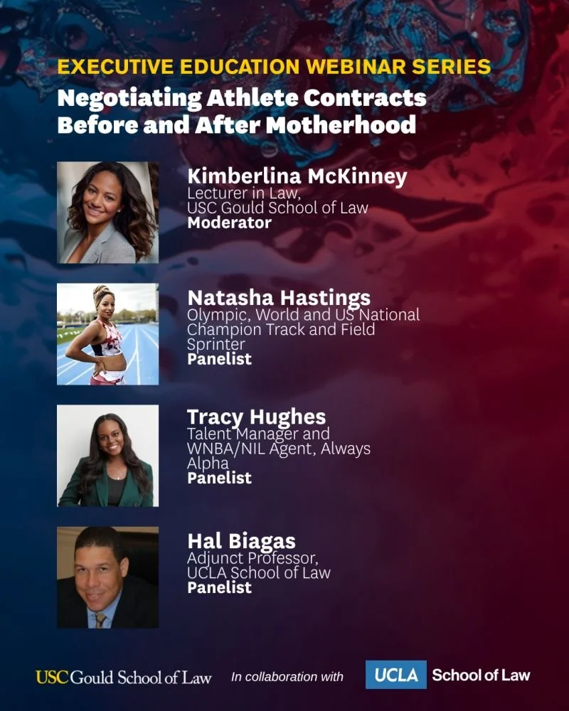 In partnership with USC Gould School of Law and UCLA School of Law, Diverse Representation co-hosts a webinar titled “The Comeback: How Motherhood is Reshaping Athlete Contracts.” Hear from agents, attorneys and athletes as they discuss best practices for structuring agreements that protect women athlete’s rights, especially in light of motherhood. Speakers include USC Gould School of Law Lecturer Kimberlina McKinney, Olympian Natasha Hastings, WNBA/NIL Agent Tracy Hughes and UCLA School of Law Professor Hal Biagas for an immersive discussion.